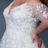 A plus size ball gown with a flattering sweetheart neckline and illusion lace bodice. The gown features embroidered lace appliques, sequins, and crystal buttons for a perfect fit. It includes light satin lining and a 55-inch waist train.
